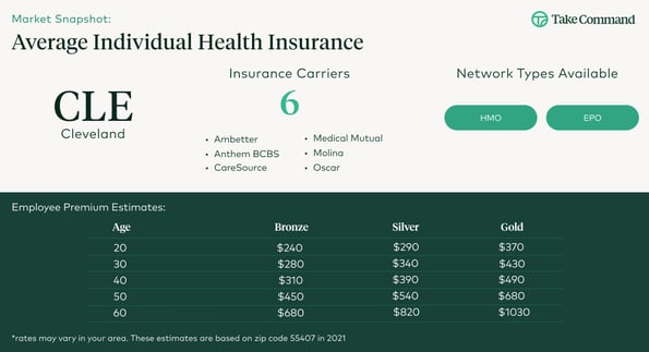 Cleveland's competitive individual health insurance market and innovative carrier lineup mean more choices for employees. The infographic below demonstrates the wide range of carriers, network types, and average lowest cost premiums by tier.